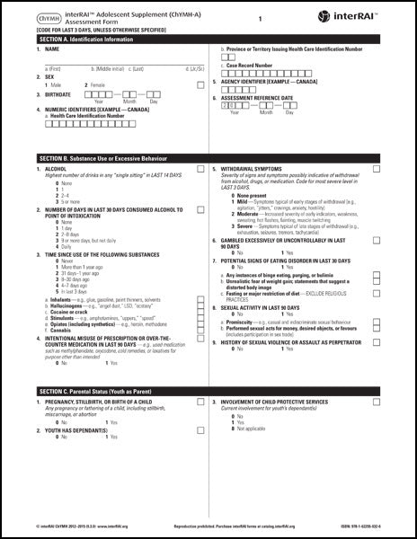interRAI Adolescent Supplement (ChYMH-A) Assessment Form, (Standard English Edition), 9.3.0 - License to Print